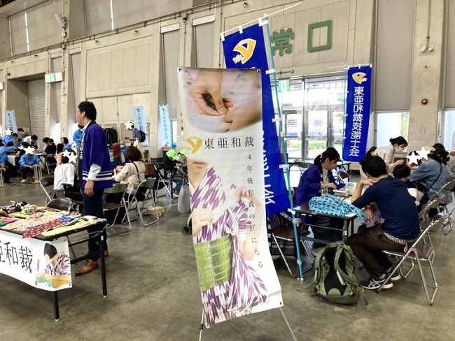 東亜和裁ブースは黄色い東亜マーク(衿の形)が付いた青い法被とのぼりが目印!