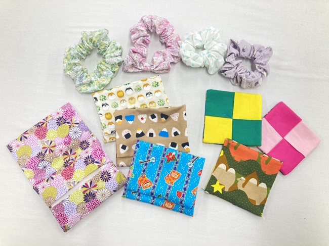 今回の体験で制作していただく小物は、可愛いシュシュポケットテッシュケースコースターの3種類をご用意しました。(柄もお選び頂けました!)