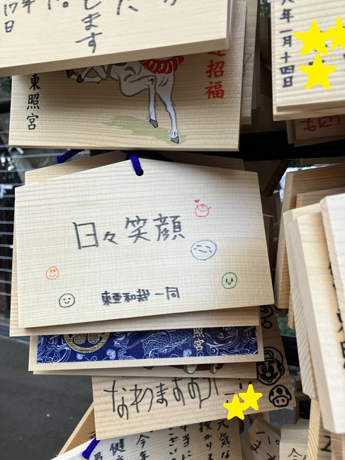 毎年恒例の絵馬は今年は日々笑顔。その周りにみんなで笑顔を描きました。出来上がってから全員もう少し大きく描けばよかったねとなりました。遠慮深い仙台支部です☺︎