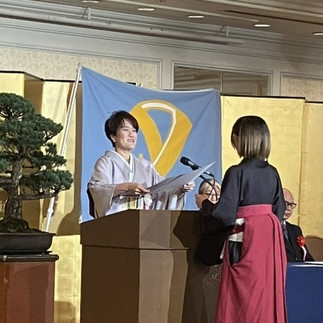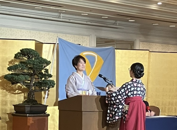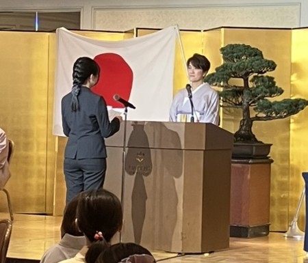総合交流会は午前の部(式典)と午後の部(パーティー)の二部式で行われます。式典は初めに国家斉唱と研修訓唱和に続いて、2025年度のコンクール受賞者・成績優秀者・皆勤賞受賞者の表彰が行われました。